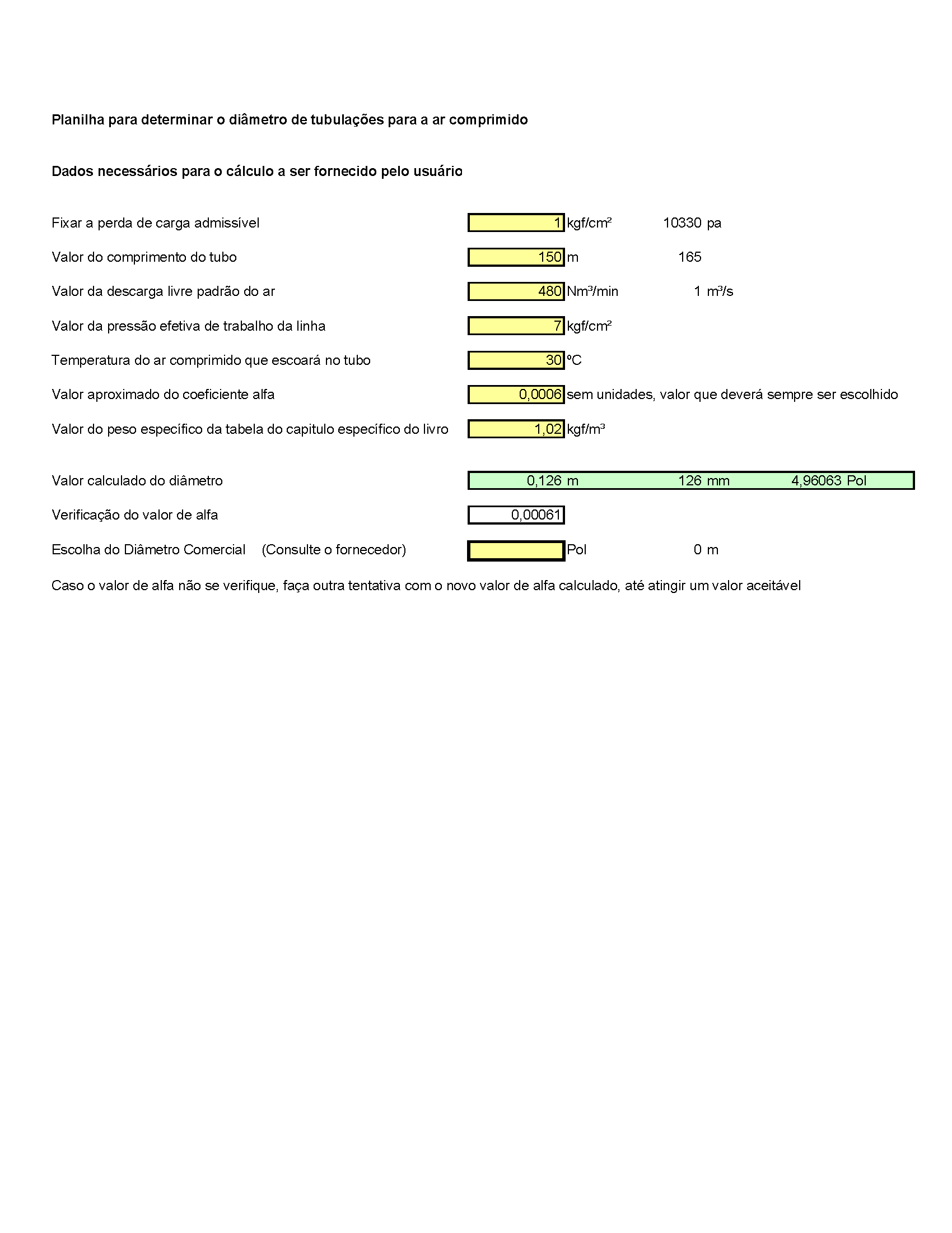 Planilha para calculo do diametro de tubulações de ar comprimido