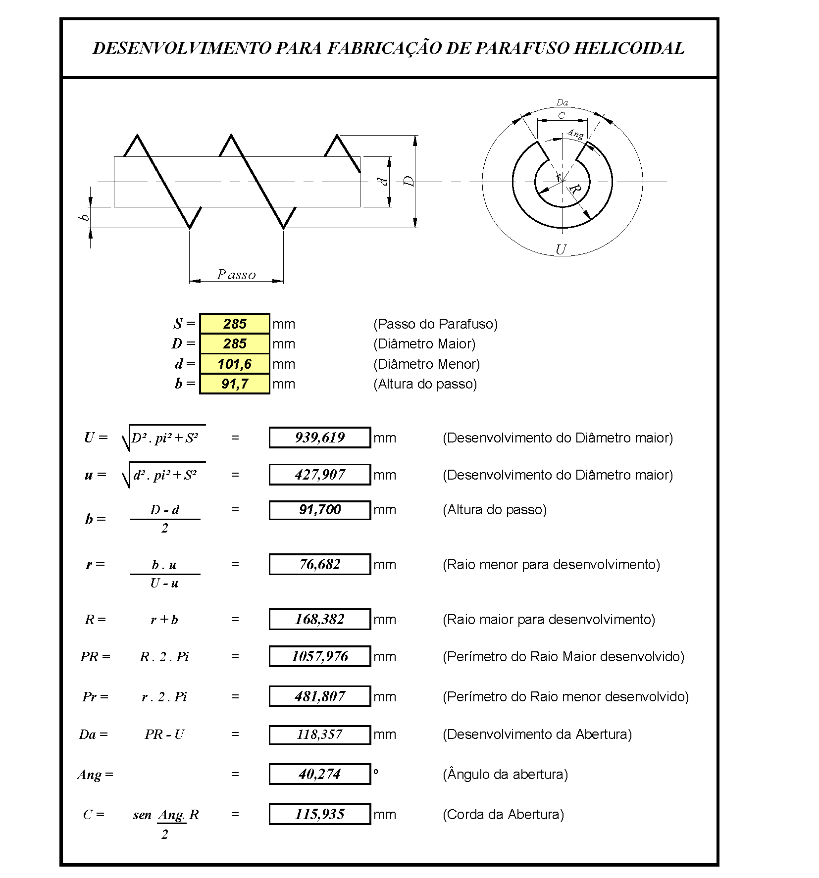 Planilha calcula a planificação de chapa para fabricação de rosca helicoidal.