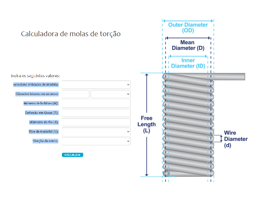 Online calculation to calculate torsion springs. Tickets: Inner or outer diameter Number of coils (N) Deflection in Degrees (T) Wire diameter (d) Type of material (E) Direction Credits: https://www.newcombspring.com/ Your browser does not support iframes. Technical BibliographySprings Technical Tables Online Calculations: ORING RING CALCULATOR OF DYNAMIC AND STATIC SEALING Online calculations: Traction coil springs Online calculations: Torsion coil springs Online calculations: Compression coil springs Online calculations: Power selection in industrial elevator systems Online calculations: Power selection in industrial electric car drive Online calculations: Selection of gear motor and power in Indoor flat belt drive Online calculations: Selection of gear motor and power in roller conveyor drive Online calculations: Power selection for ball screw travel Online calculations: Thermal history and welding cooling time in arc welding