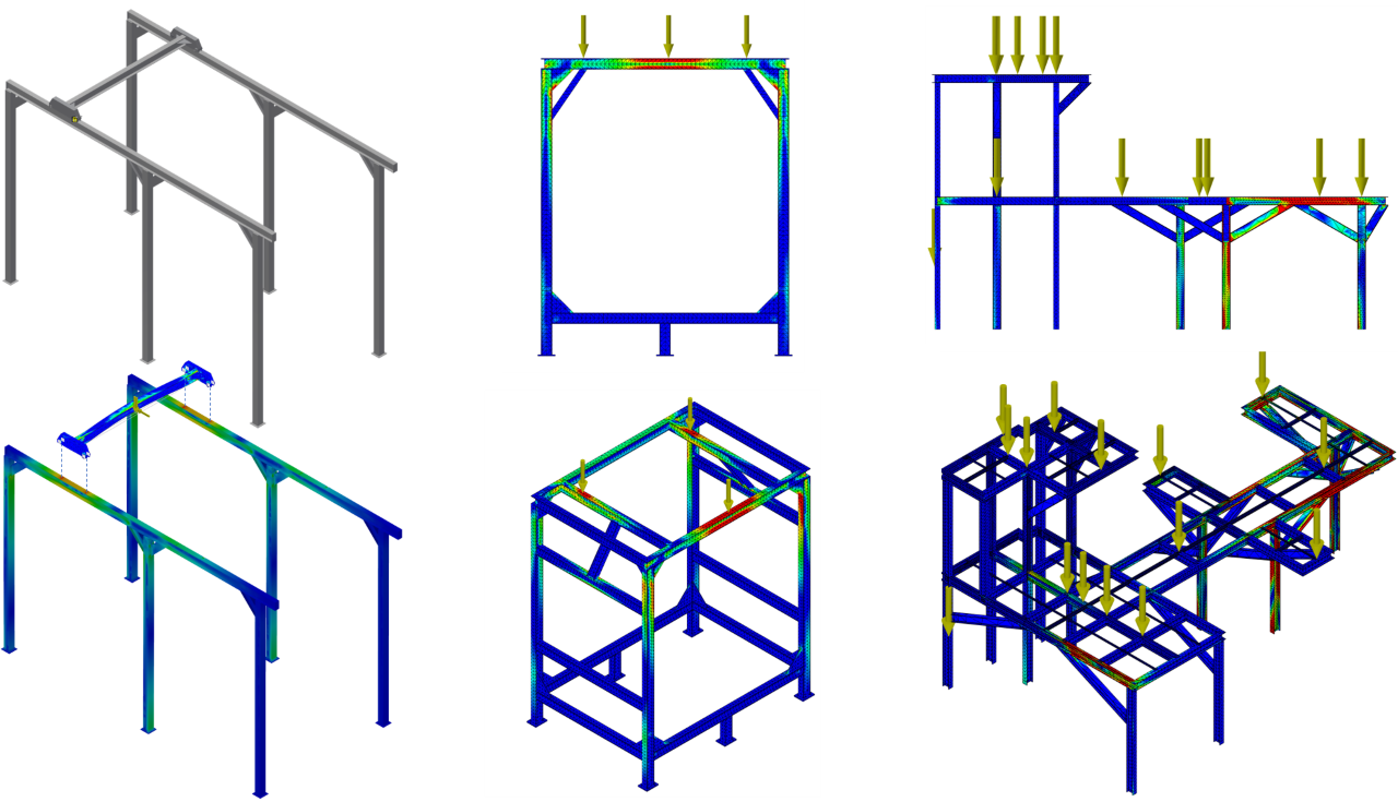 Publicized Projects FP 3D modeling and study of efforts using the Finite Element method – UGLY (Finite Element Analysis) for checking the structural integrity and load capacity of the most varied types of industrial equipment: scouts, reactors, heat exchangers, access platforms, stairs, pipe-racks, supports, cranes, woman, storage tanks (various fluids), transfer pumps, pipes, valves and others. The drawings can be executed freely or on a floor plan/model sent by the customer.
