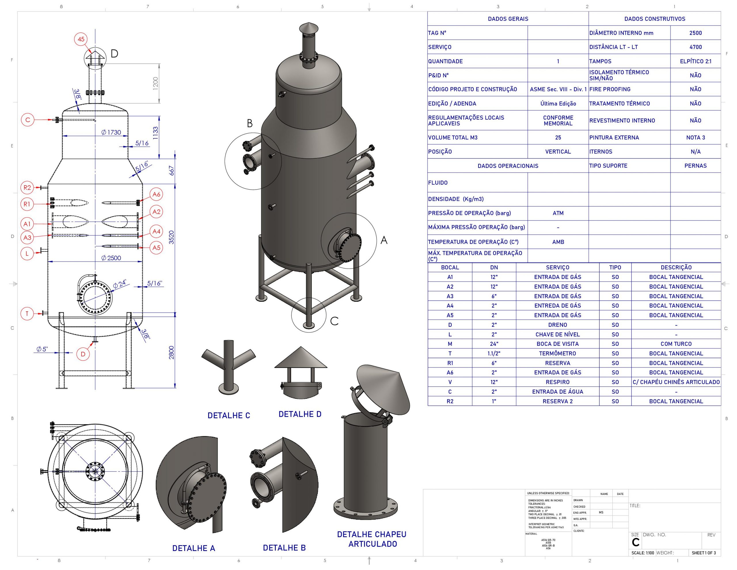 Publicized Projects FP Equipment entirely manufactured in AISI-304 stainless steel; General dimensions of the side: Ø513mm x 680mm high; ASME Torispheric Top Top 10% swivel with davit and 12 (dose) grip handles; ASME Torispheric Bottom Top 10%; Internal flange with drilling for support of 03 (three) filter elements each filter; 03 (three) “CREPINAS” spiral bag holder…