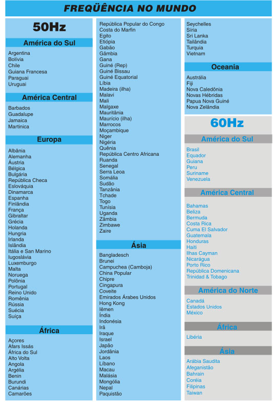 Segue Tabela com as Frequências das redes elétricas no mundo. frecuencias (Hz) no MundoComparte esto:Correo electrónicoFacebookLinkedInWhatsAppTelegramaGorjeoPinterestImprimirMásTumblr