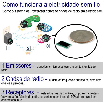 A Powercast criou um pequeno transmissor que envia baixas voltagens de energia pelo ar, a partir de uma tomada, usando ondas de radio, de forma segura para nós humanos.