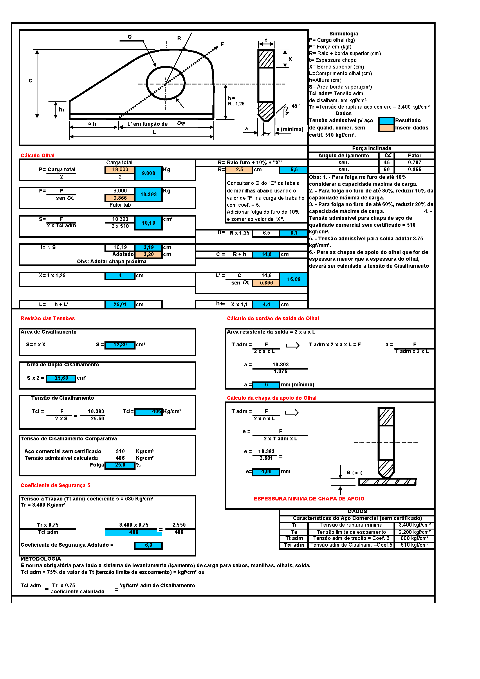 Entre las variables calculadas se encuentran el grosor de la placa de ojal, espesor de la placa de respaldo, cordón de soldadura de ojo, altura y longitud de los ojos.