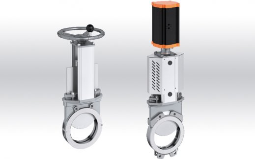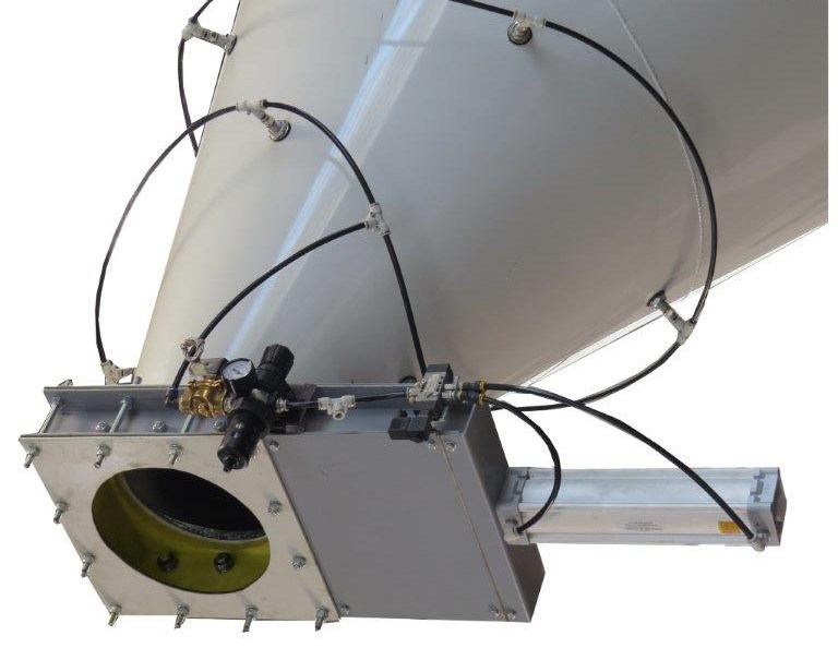 Válvula de guillotina para control de salida de silos de cemento de accionamiento eléctrico.