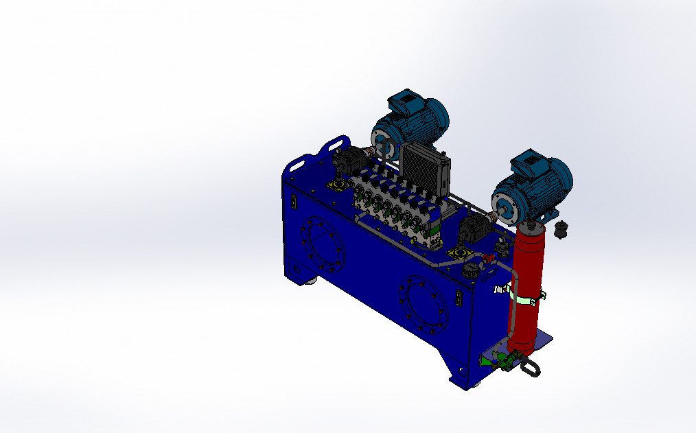 Unidad hidráulica de autoeficiencia industrial, que contiene 2 motores eléctricos de 15 CV , bomba hidráulica externa , accionamiento electroneumático con bloques de distribución y electroválvulas, trocador de calor.