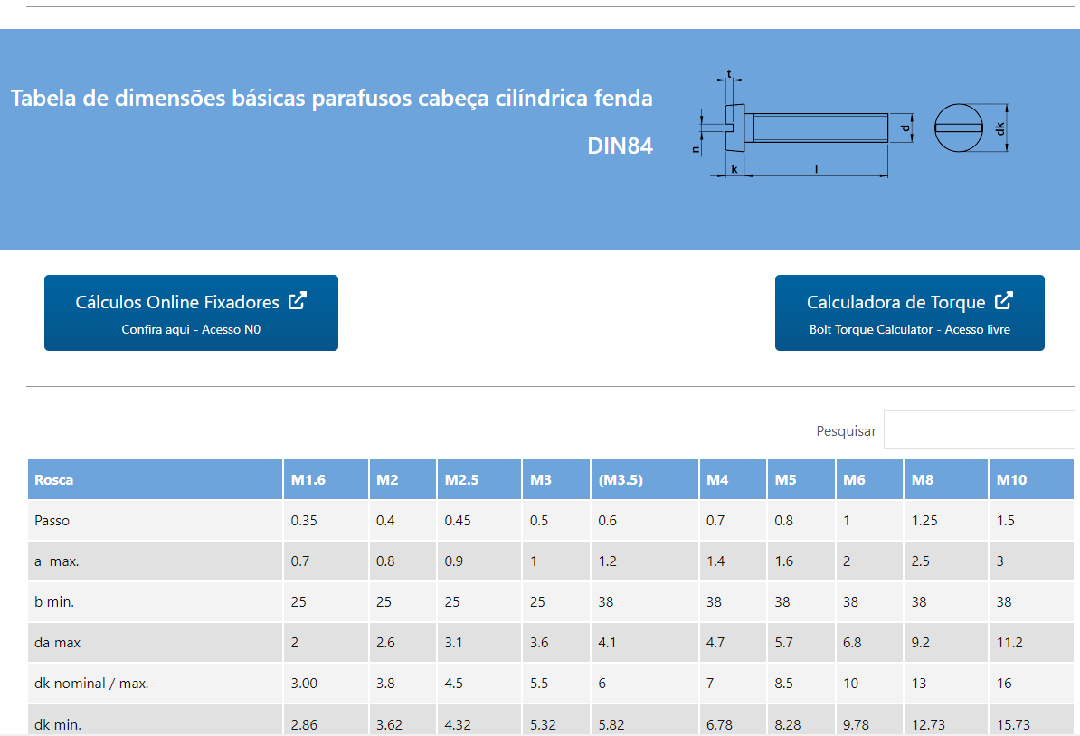 Tabla de dimensiones básicas tornillos cabeza cilíndrica ranurada DIN84