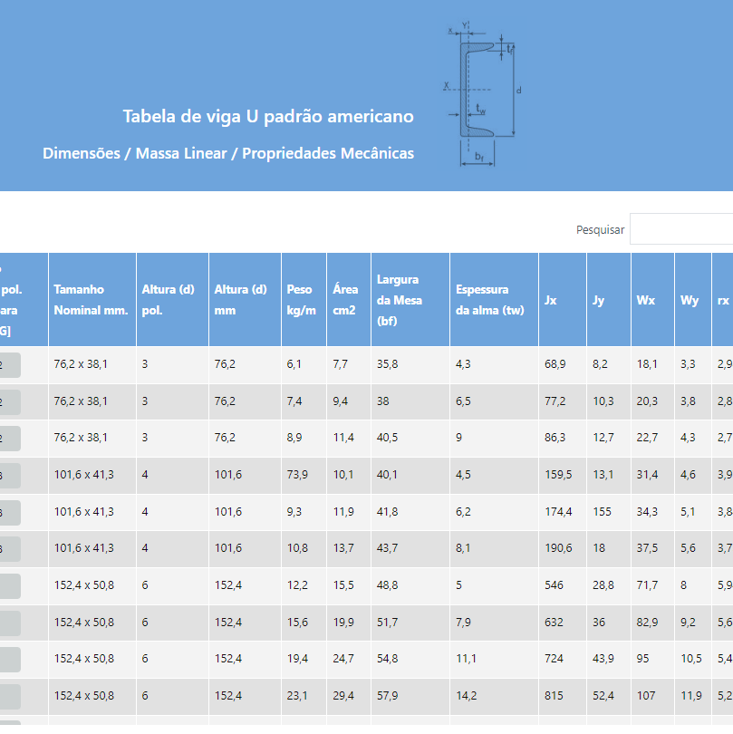 | Tamaño nominal en. [Haga clic para DXF/DWG] | Tamaño nominal mm. | Altura (d) pol. | Altura (d) mm | Peso kg/m | área cm2 | Ancho de la mesa (bf) | espesor del alma (tw) | Jx | Tú | Wx | Wy | rx | ry |