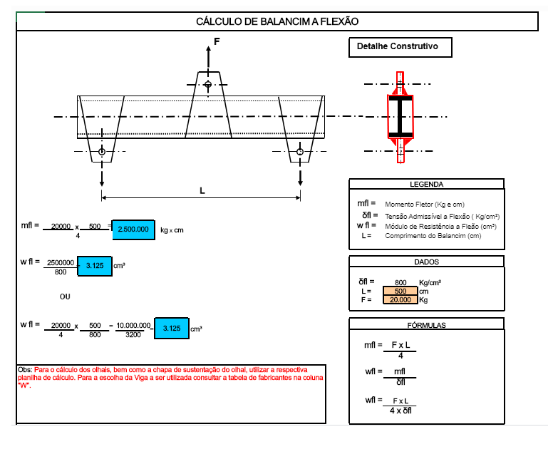 Calcula el diseño del balancín de la viga de flexión. Los datos de entrada: -Largo / Forzar datos de salida: Momento de flexión / Momento de resistencia / Esfuerzo de flexión admisible