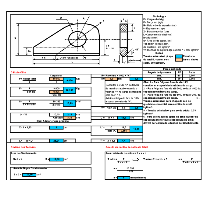 Entre las variables calculadas se encuentran el grosor de la placa de ojal, espesor de la placa de respaldo, cordón de soldadura de ojo, altura y longitud de los ojos.