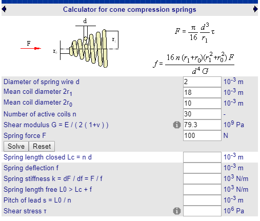 Fábrica de proyectosCálculo mecánico, Cálculos Online, Cálculos Online: muelles, Cálculos Técnicos, FPH, muelles, Proyectos MecánicosCálculos para diseño mecánico, Cálculos para Ingeniería Mecánica, cálculos mecánicos en línea, Cálculos Online, Cálculos Online: Muelle de compresión Perfil cilíndrico de muelle helicoidal cónico, cálculos mecánicos, cálculos mecánicos en línea, Muelle de compresión Perfil cilíndrico de muelle helicoidal cónico