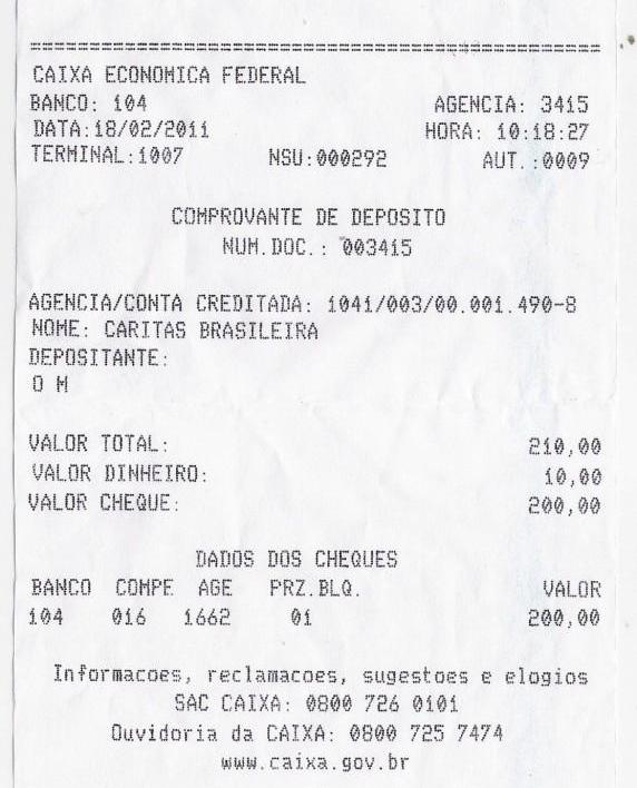 La Fabrique à Projets, tel que publié, estará repassando R$204,00 para a conta da CNBB & Cáritas: