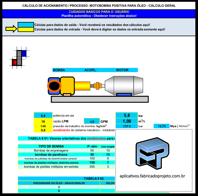 Feuille de travail pour le calcul de l'engrenage de pompe positif pour la puissance de calcul de l'huile, débit, pression et autres grandeurs de processus