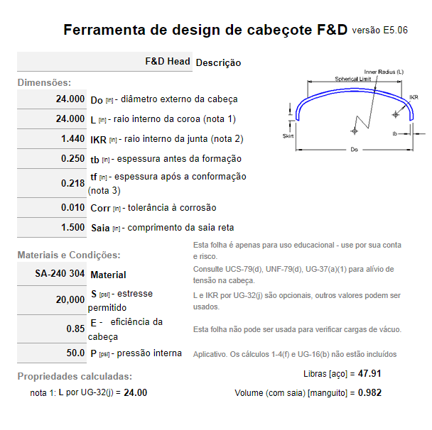 Calcule l'épaisseur de paroi requise ou la pression de service maximale autorisée d'un dessus torisphérique ASME VIII-1. Les dimensions suggérées sont fournies pour calculer une proportion standard. Calcule également le volume et le poids. Pression interne uniquement!