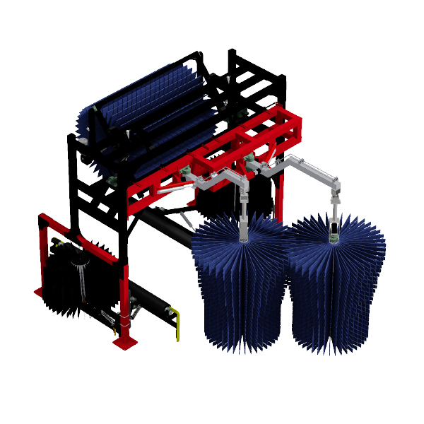 Equipamento para limpeza de container, que consiste no uso de escovas laterais ajustáveis a largura do objeto e escova central que desce para limpeza do interior do container que corre sobre esteira de alimentação continua com 2 tipos de jatos de agua, e no fim passa por jato de ar comprido. Pode ser usado como base o serviço de lavagem de carro automático estilo portal e tunnel.