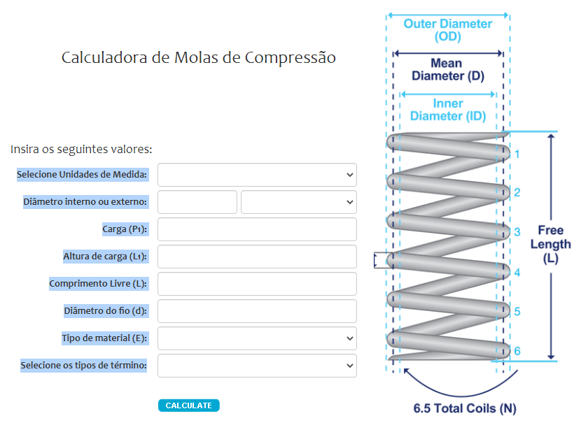 Calcolo online per il calcolo delle molle a compressione. Biglietti: Diametro interno o esterno Caricare (P1) altezza di carico (L1) Lunghezza libera (l) Diametro del filo (D) Tipo di materiale (E) Seleziona i tipi di terminazione Crediti: https://www.newcombspring.com/ Your browser does not support iframes. Bibliografia tecnicaSorgenti Tabelle Tecniche Calcoli in linea: Calcolatore ad anello di oring della sigillatura dinamica e statica Calcoli in linea: Molle elicoidali di trazione Calcoli in linea: Molle elicoidali a torsione Calcoli in linea: Molle elicoidali di compressione Calcoli in linea: Scelta della potenza negli ascensori industriali Calcoli in linea: Selezione della potenza nell'azionamento di auto elettriche industriali Calcoli in linea: Selezione del motoriduttore e della potenza nella trasmissione a cinghia piatta per interni Calcoli in linea: Selezione del motoriduttore e della potenza nell'azionamento del trasportatore a rulli Calcoli in linea: Selezione della potenza per la corsa della vite a ricircolo di sfere Calcoli in linea: Storia termica e tempo di raffreddamento della saldatura nella saldatura ad arco