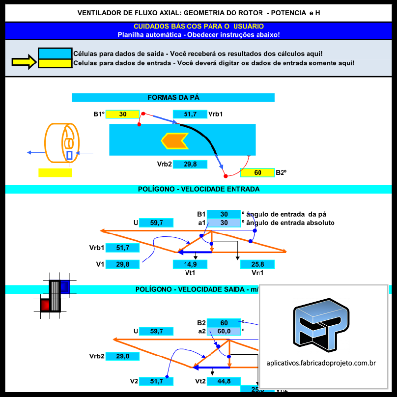 Planilha para Cálculo de Geometria Rotor Ventilador Axial calculando potência, diâmetros, ângulos e diversas grandezas geométricas…